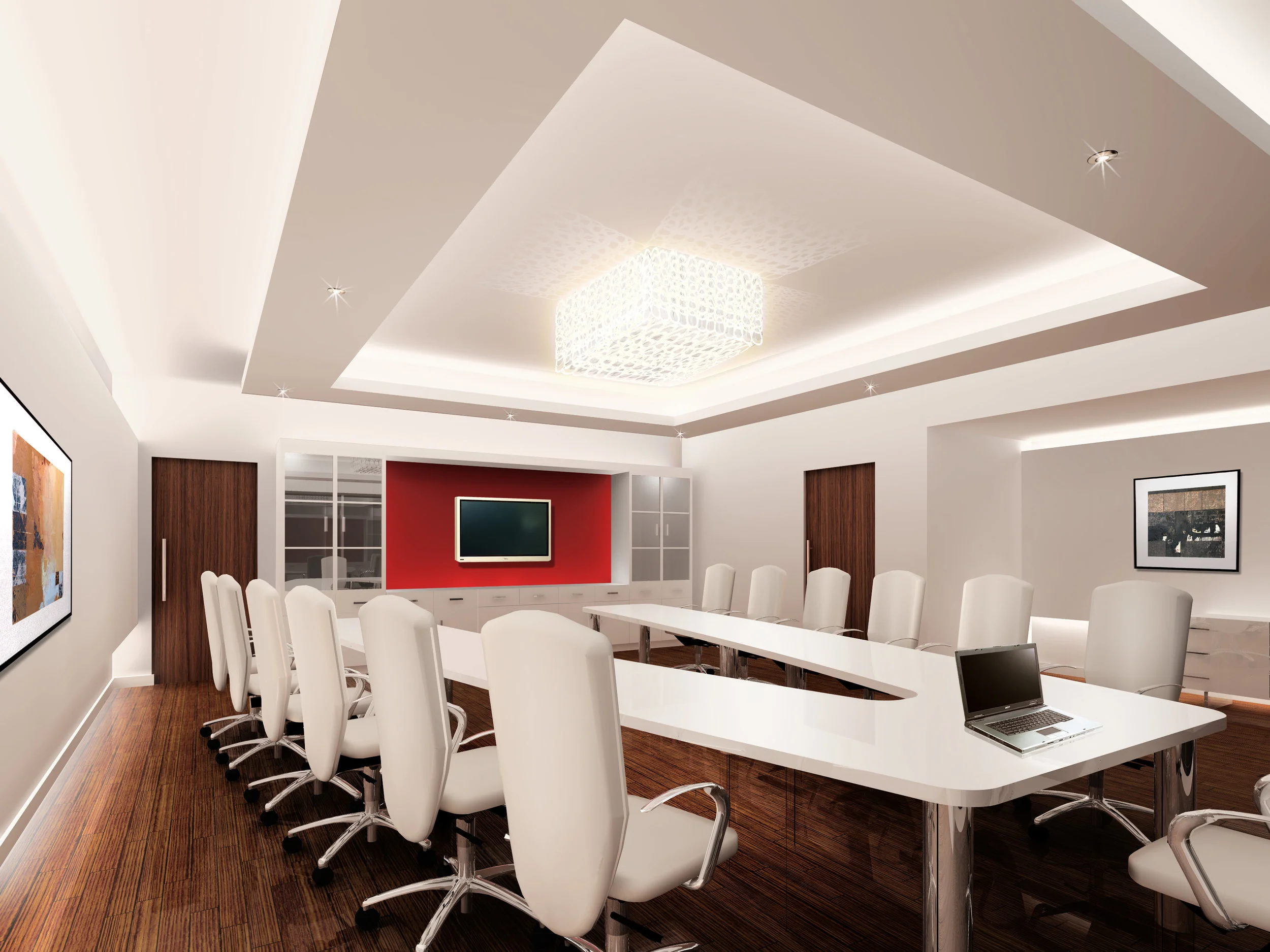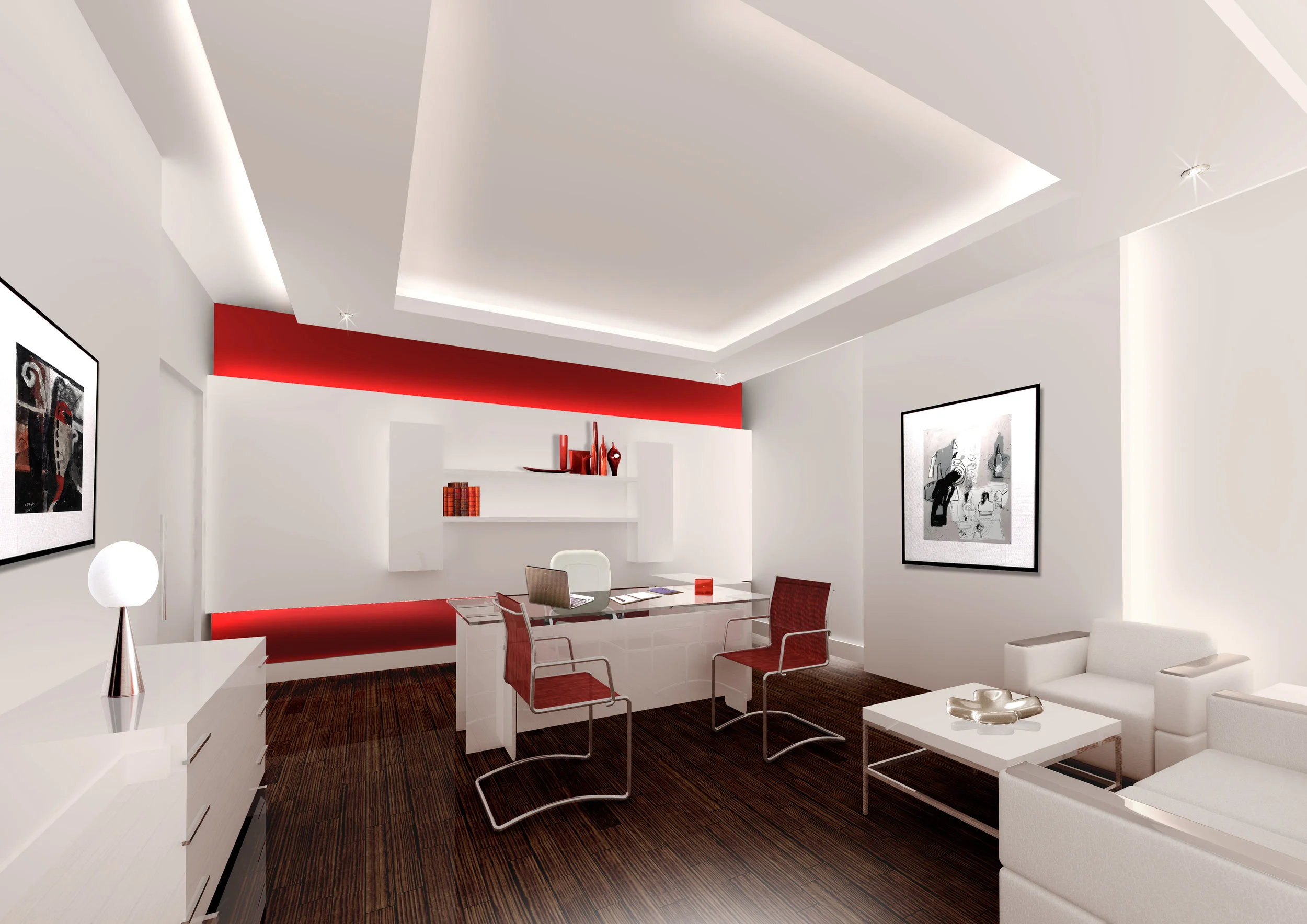 A basic neutral color palette, symmetric forms and bold accents, amass collectively to give a clean finished corporate identity.